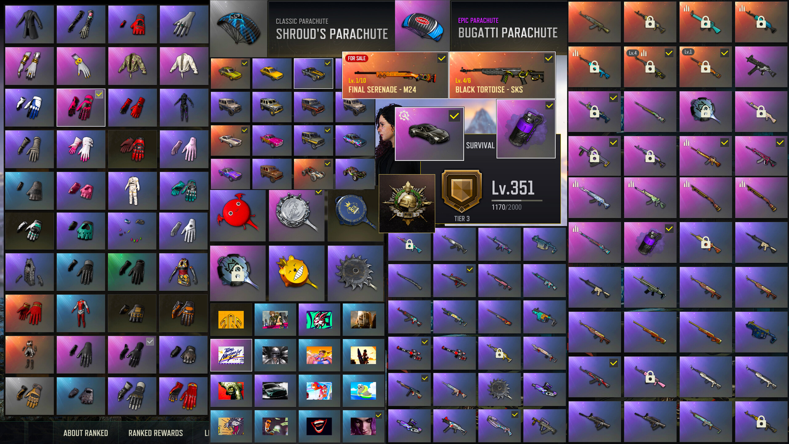 PUBG STEAM ACCOUNT FROM SEASON-2 & SURVIVAL TIER-3 ( +351 ) | [PROGRESSIVE] BLACK TORTOISE - SKS LV.4 | [PROGRESSIVE] FINAL SERENADE - M24 LV.1 | PGI.S HYDRODIP - SLR | MAZARIN1K'S SLR | PURPLE SMOKE GRENADE | RASH BEIXI'S SLR | "V12 VANTAGE ROADSTER" SPORTS CAR | PCS4 "GOLD METTLE" MOTORBIKE | "DINOLAND" DACIA | "TAXICAB" DACIA | "DUST IN TIME" COUPE RB | "PCS3 TAGGED OUT" UAZ | "KISS THE SUN" UAZ | PCS2 BUGGY | PGC 2022 COUPE RB | BUGGATTI PARACHUTE | SHROUD'S PARACHUTE | PSYCHO KILLER - SCAR-L | PORCELAIN POWER - BERYL M762 | SPELLS IN SHELLS - M164A | STANDARD SLAYER - AKM | SAND BURN - MK47 | PNC 2023 PERFECT ANGLE - ACE32 | COPPER KILLER - GROZA | GOLDEN ENCORE - AUG | SERPENT'S GARDEN - M416 | ODIN'S VANGUARD - AKM | DRAGON SPIRIT - ACE32 | SONIQS - AKM | CONFETTI CAKE - M416 | SOAK & DESTROY - AKM | TENEBRES WRAPPED - AKM | PGC 2021 CONTINGENT CHAOS - BERYL M762 | PHOENIX SPIRIT - M16A4 | PGC 2022 ACED - GROZA & BERYL M762 | 1050+ Worthwhile Skins