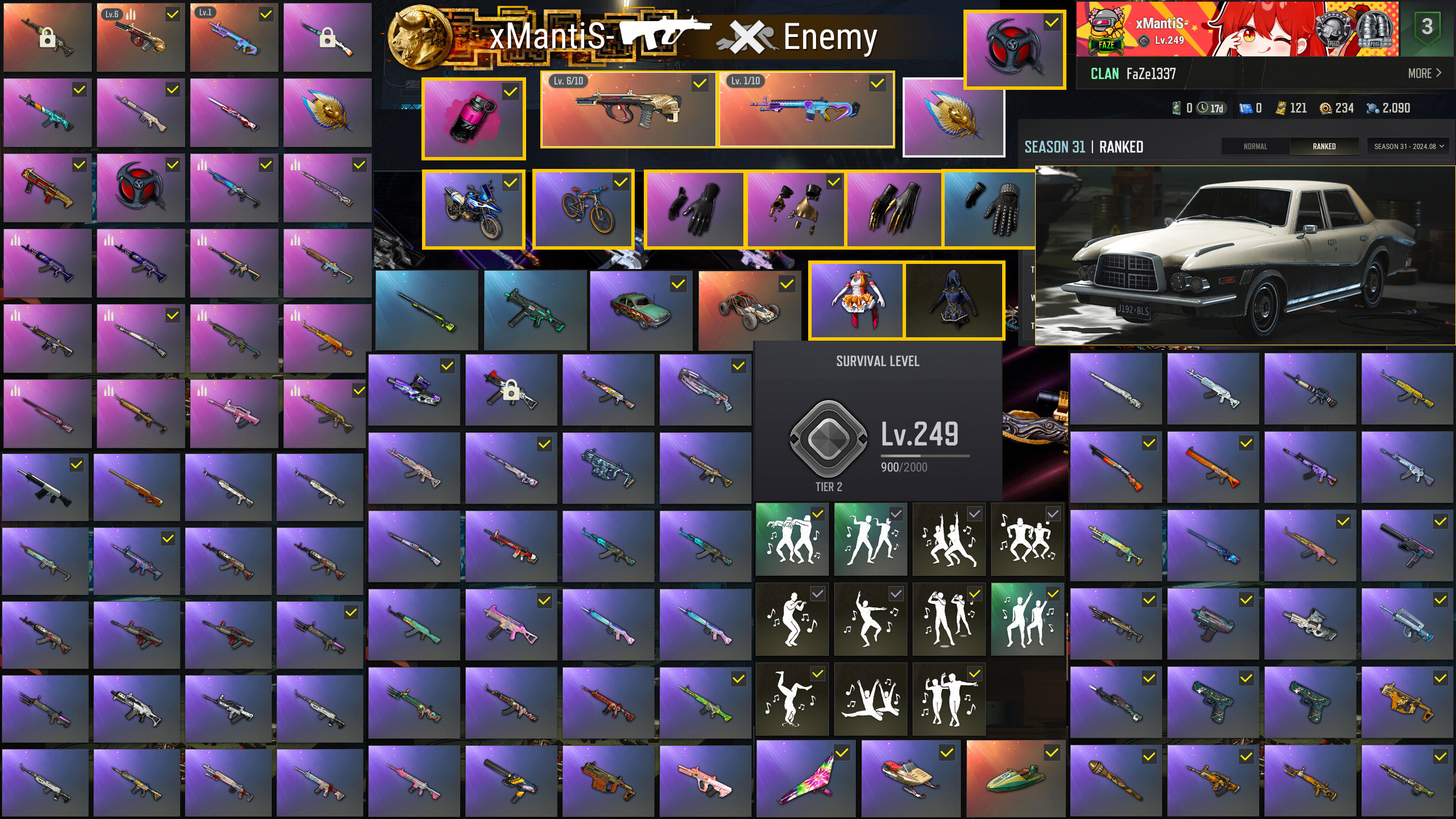 PUBG STEAM ACCOUNT FROM SEASON-1 & SURVIVAL TIER-5 ( +294 ) | NICKNAME CARD | "V12 VANTAGE ROADSTER" SPORTS CAR | [PROGRESSIVE] SUN SCORCHED - S1897 LV.1 | [PROGRESSIVE] DEMON'S TOUCH - ACE32 LV.1 | [PROGRESSIVE] HOCUS FOCUS - MK12 ( PINK YELLOW ) LV.1 | [PROGRESSIVE] SUN WUKONG - M24 LV.1 | [PROGRESSIVE] YULE SLEIGH - MINI14 LV.3 | [PROGRESSIVE] HOCUS FOCUS - MK12 LV.1 | "V12 VANTAGE ROADSTER" SPORTS CAR | "GETAWAY" SUV | "NOLE STEED" MOTORBIKE | "PCS4 GOLD METTLE" BIKE | BUNNY EXPRESS DELIVERY GLOVES | SUGAR RUSH SALLI"S PARTY DRESS ( PURPLE ) | PHARAOH"S GUARDIAN GLOVES | MEDUSA"S TOP | SUGAR RUSH SALLI'S FULL SET | MARINA MISFIT GLOVES | PGC 2021 GILTSLATE CONTAGION FULL SET | ENDURO STUNT SUIT | PNC 2024 FULL SET | PNC 2023 FULL SET | MEDUSA'S FULL SET | ANKLE BANDOLIER FULL SET | SPACE CRITTERS HOODIE | PNC 2025 JACKET | ENDURO STUNT SUIT | ASTRO BUNNY T-SHIRT | PGC 2023 EMPEROR"S CLOAK | PCS6 BRUSHSTROKE JACKET | MAD PATIENT'S JACKET | AURA HOODIE | PCS2 CONTENDER HOODIE | ASTON MARTIN JACKET | SERPENT'S GARDEN JACKET | EZQELUSIA'S SHIRT | MINORU'S HOODIE | TENEBRES WRAPPED - AKM | SUN WUKONG - AKM | ODIN'S VANGUARD - AKM | JIGSAW - MINI14 | STEEL THE SHOW - SKS | GREEK FREAKS - QBU | VALHALLA - SLR | GOLD PLATE - SLR | MINORU'S MINI14 | LOVE SONG LONGSHOT - KAR98K | SUN WUKONG - M24 | MEDUSA - KAR98K | ZHU BAJIE - AWM | EXINCTION - M24 | NO MERCY - KAR98K | 1350+ Worthwhile Skins